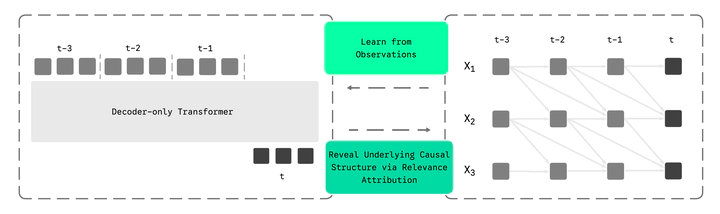 Our key insight: These two worlds are deeply connected. When a transformer learns to predict the future from the past, it must implicitly learn which past variables actually matter for each prediction. This is exactly what causal discovery aims to find.